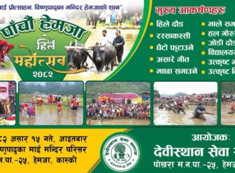 देवीस्थान सेवा समाज हेमजाको आयोजनामा यहि असार १५ गते हुने पाचौं हेमजा हिले महोत्सवको तयारी पुरा भएको छ । महोत्सव अन्तर्गत हिले दौड, रस्साकस्सी, घैटो फुटाउने, कृषि झाँकी प्रदर्शन, विद्यालय स्तरीय धान रोपाई प्रतियोगिता, उत्कृष्ट किसान सम्मान, हलगोरु तथा जोडी दौड, आमा समूह बीच असारे भाका, हिलोमा भाले तथा माछा समाउने लगायतका प्रतियोगिता हुँदैछन् । महोत्सवको तयारी स्वरुप महोत्सव स्थल वरपर सरसफाई गरिसकिएको छ भने खेत हिल्याउने कार्य समेत सुरु भएको छ । हेमजालाई कृषि पर्यटनसँग जोड्न विष्णुपादुका धार्मिक क्षेत्रको… पुरा पढौ